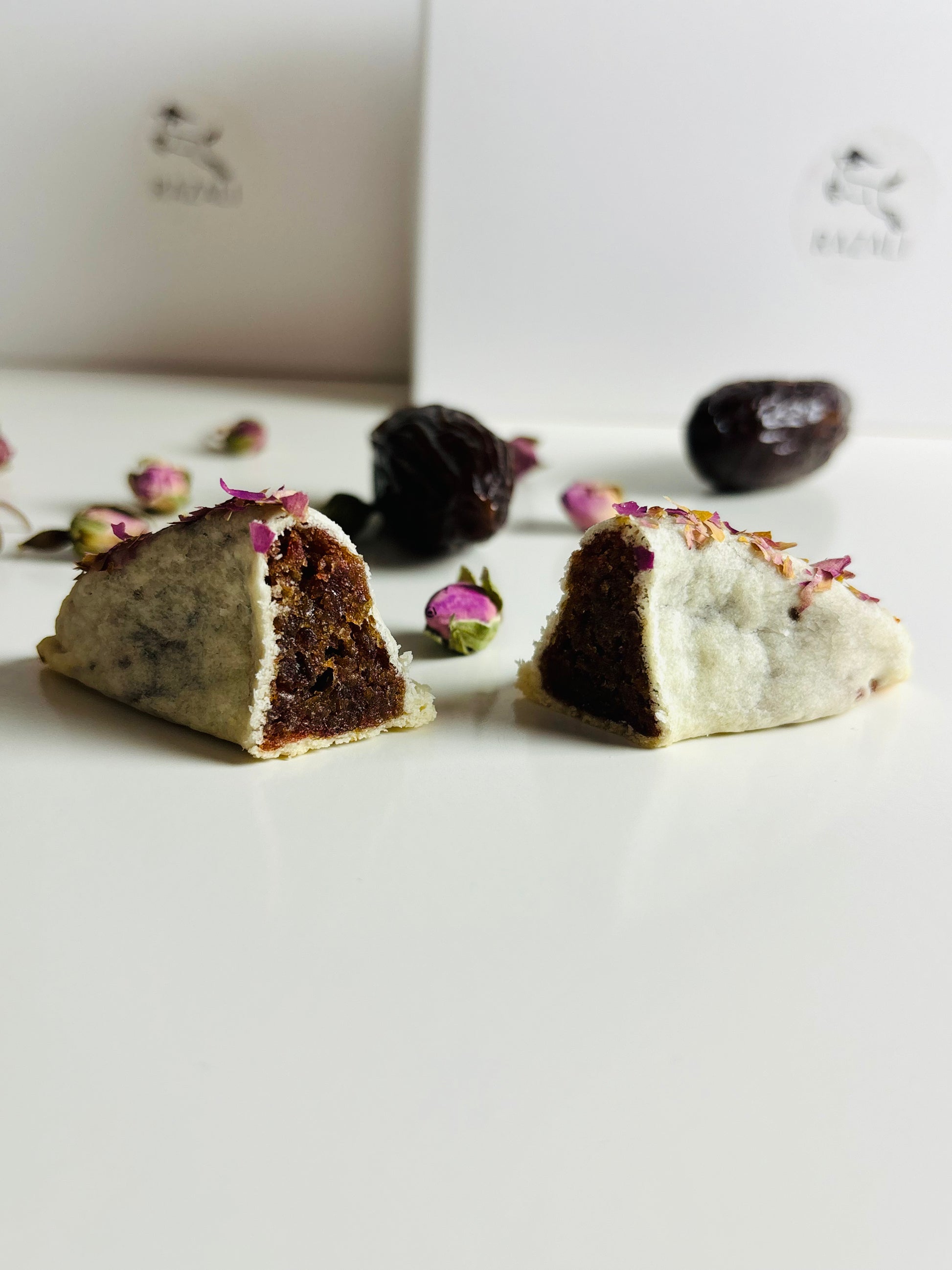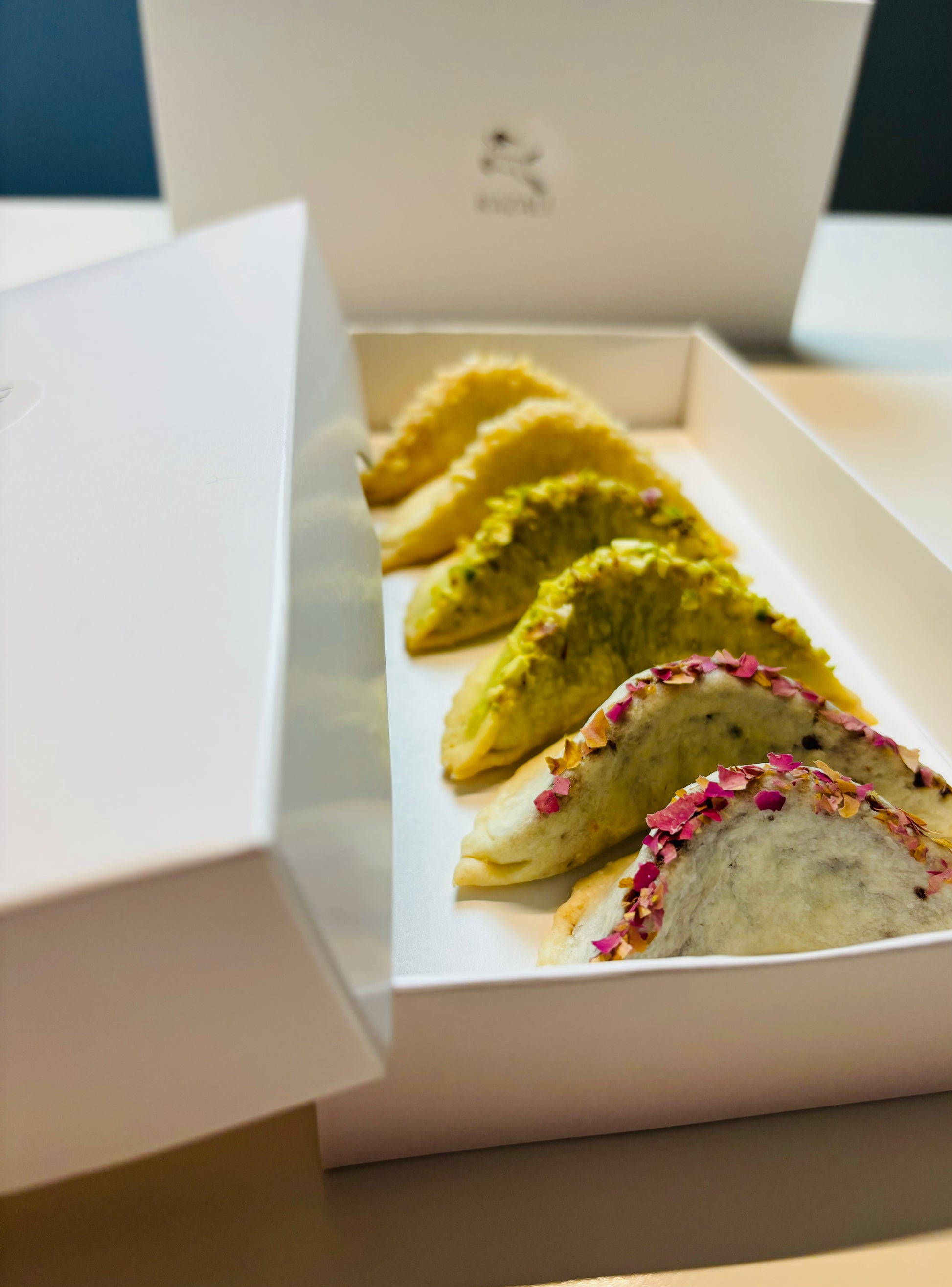 Si aucun choix n'est précisé, nous préparons un assortiment équilibré : 2 cornes de gazelle amandes & fleur d'oranger, 2 pistaches & vanille et 2 dattes & eau de rose.